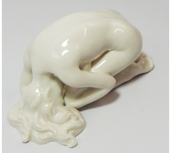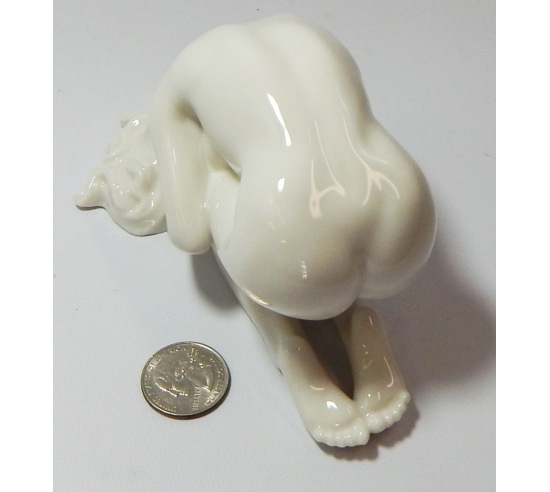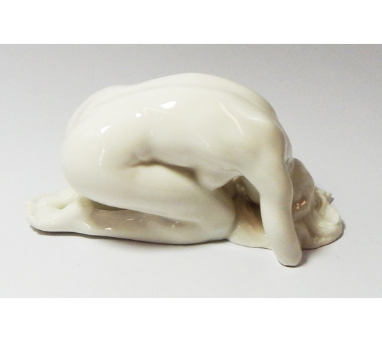 A naked female kneeling and bent over. Her position is ambiguous and suggestive of prayer, grief, or weariness. Let your clients tell their story with this porcelain figurine measuring 6" x 3" x 3"'.