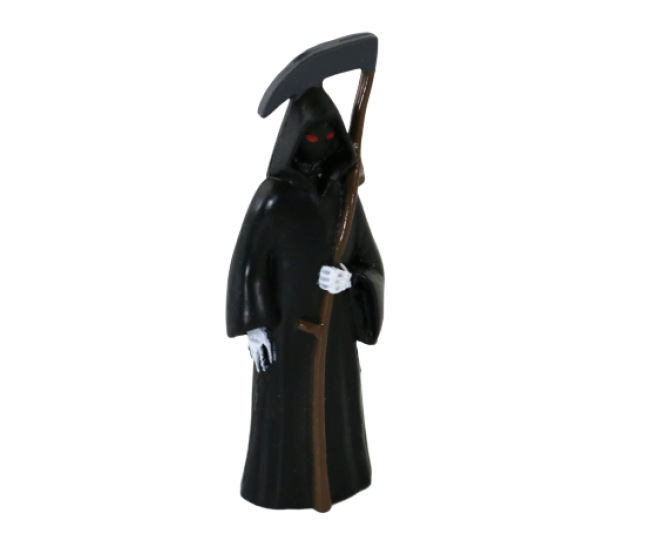 Red eyes, skeleton hands, and scythe make this grim reaper a chilling piece for sandplay. Made of plastic and 3", perfect a portable sand tray too.