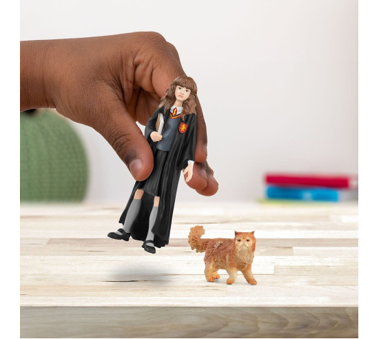 The studious pupil from Gryffindor House, Hermione Granger, carries a book under her arm while her highly intelligent pet cat, Crookshanks, remains faithfully by her side. Figure stands approximately 3.9" tall.