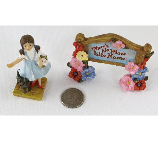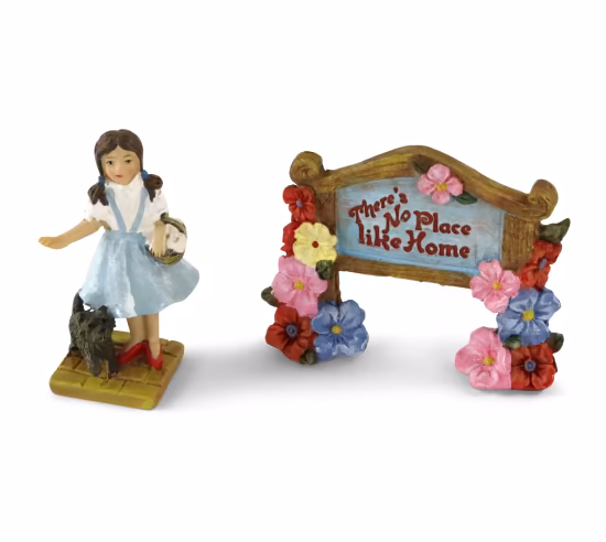 Truly there is "no place like home". Two piece set from the iconic Wizard of Oz® includes Dorothy and Toto and a sign stating "There's No Place like Home". Both pieces are resin. Dorothy is 3" tall.