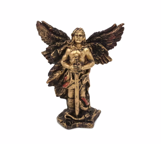 Majestic piece of a bronze-colored angel holding a sword and stomping a snake. May remind clients of protection, God, or heaven. Nice sized piece for a regular sand tray, measuring 6" tall.