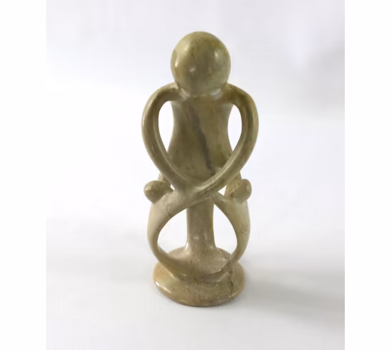 This handcrafted miniature sculpture depicts a large abstract adult figure accompanied by two children, crafted from a single piece of soapstone. Measuring 8 inches tall, this larger figurines features a smooth, hand-sanded finish and showcases the natural variations in color and texture of the stone, making each piece truly unique.