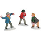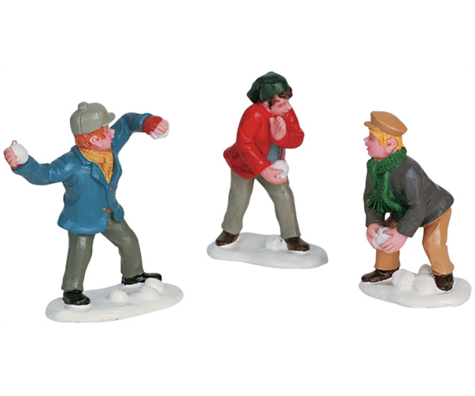 Three young boys having a snowball fight. One in a protective pose, another building snowballs and another ready to throw. Each figurine measures 2" in height.