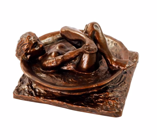 This replica of a woman bathing is sturdy and unique. Made of resin with a bronze finish and measures 5.5" x 4.75" x 3". May be symbolic of cleansing or feeling exposed.