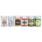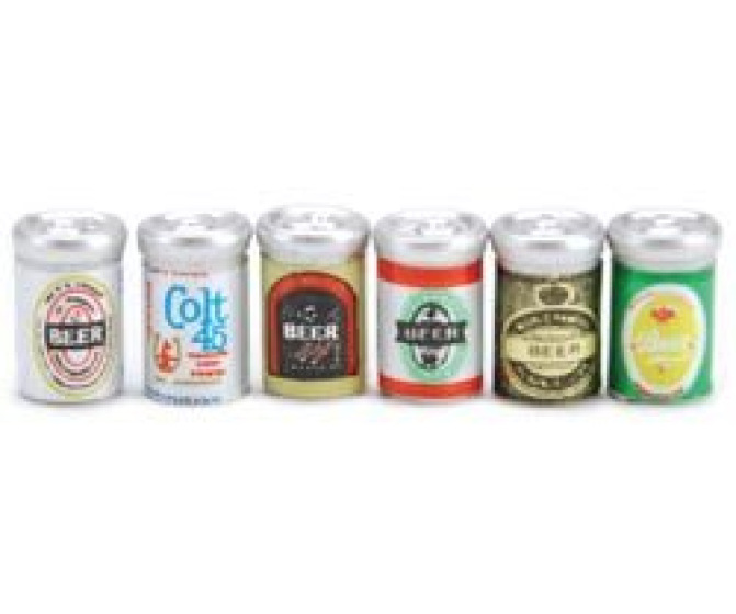Set of six assorted beer cans for sand tray therapy. Cans are tiny, about 1/2" tall but perfectly sized for sandplay.