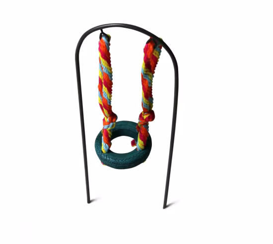 This tire swing will remind your clients of warm summer days. Wire hanger with rainbow ropes and turquoise swing measures 8" tall.