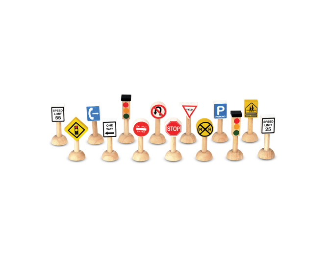 Fun wooden set of traffic signs and signals. Includes 14 different signs. These mini signs are fun for role playing, or have many symbolic uses in the sandtray.