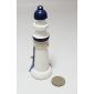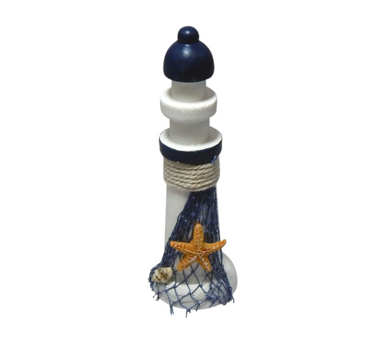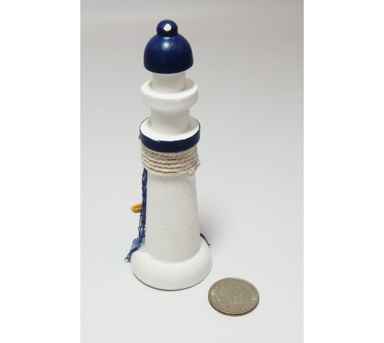 A five inch wood lighthouse with intricate details for sand tray therapy. Painted wood lighthouse has netting and shells attached. 5" in height.