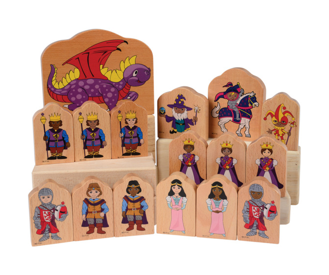Add some medieval fun to your playroom with the Multi-Ethnic Royal Court Playset. 16 quality hardwood figures feature a variety of characters for a dramatic royal playscene, including knights, dragons, princesses, a jester, a wizard, and kings. Characters reflect a diverse variety of ethnicities. Each figure is printed front and back. Most figures are around 2" tall. Dragon is 4" tall.