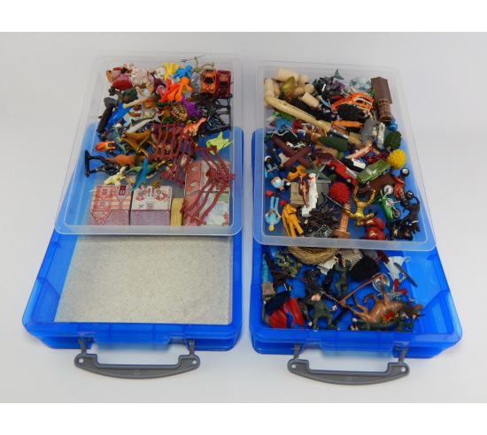 The sand tray, made in the USA, has handles that lock the lid securely in place when not in use or when transporting. The sand tray measures 14 5⁄8" x 10 1⁄4" x 3 3⁄8". The beautiful blue tone is perfect for representing the sky or water. Inside the sand tray is a removable insert to hold your figures without them lying in the sand! Figures fit perfectly with a little room for a few more miniatures to customize your set. With two trays and inserts, sand can be stored in the bottom, and miniatures in three other sections!