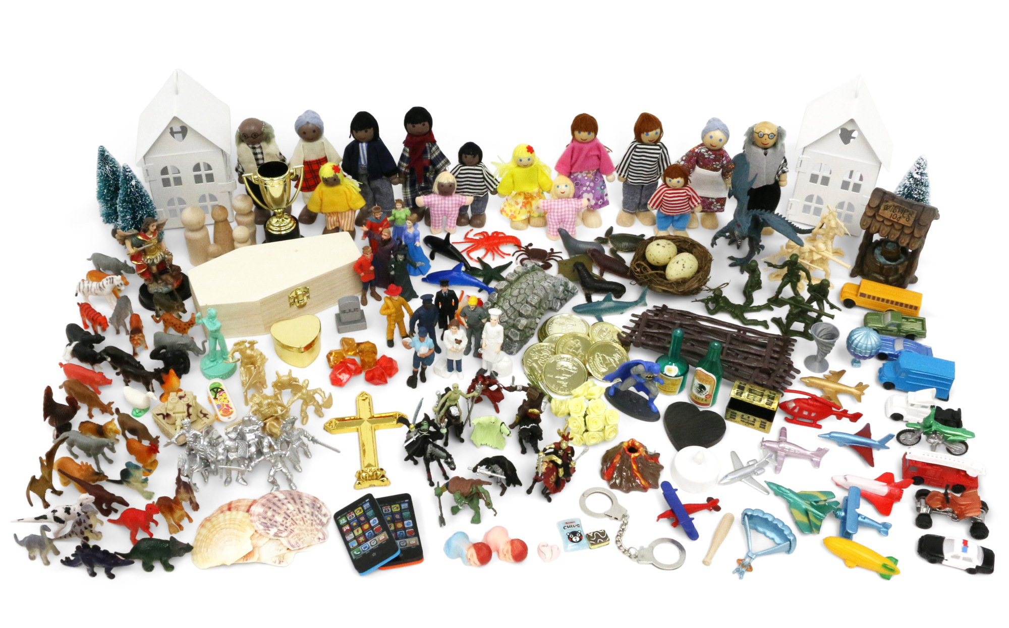 Our Premium Sand Tray Starter Kit took us months to put together to ensure best quality. Customers have raved about the hollow houses, diversity of people figures, mythical and religious items, and symbolic items. You will not find such a variety of high quality, usable miniatures for sandplay therapy in one set.