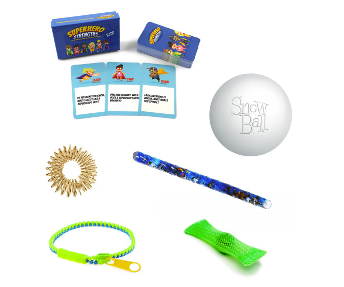Limited time availability! While supplies last. If an item is out of stock, a product of equal or greater value will be substituted. Therapists and counselors, this is a great deal for families at home! Includes Superhero Strengths card game, five fidgets, and a tip sheet for coping with the quarantine and uncertainty we face at this time.