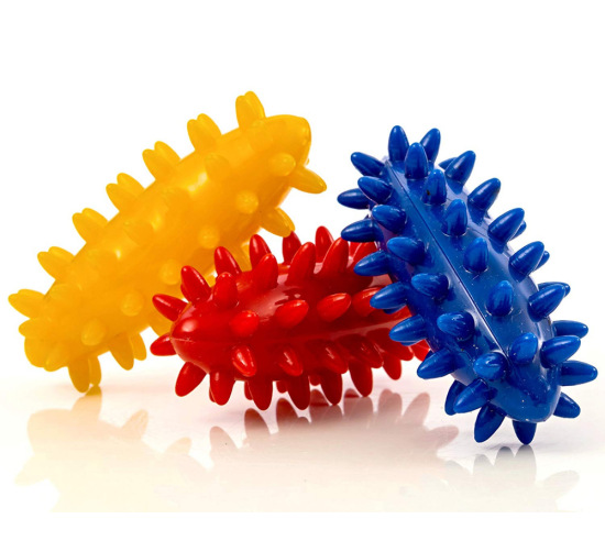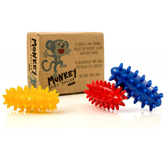 Set of three spiky rollers are durable and useful for sensory seekers. Firm pressure for children, teens and adults and can be put in pocket or used in the classroom. Also a useful massage roller. Made with 100% high-quality thermoplastic rubber, they are hypoallergenic, nontoxic, and free of BPAs, phthalates and latex. 3" long.