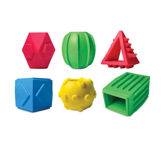 The brightly colored material is soft and flexible, yet durable enough for lots of touching and squeezing. Each shape has a recognizable geometric form: triangle, circle, oval, rectangle, square, hexagon. The surfaces have raised bumps, ridges and grooves that reflect the overall shape and stimulate the sense of touch.