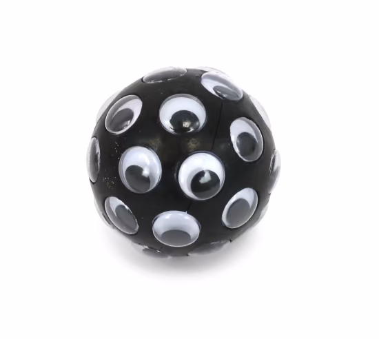 The ball that looks at you while you look at it! The Google Eye Ball features dozens of googly eyes that look around as the ball is moved and rotated. Has an interesting visual and audible feedback, and makes fun satisfying sounds when rolled on a table or desk. For rolling, shaking, and tossing, but not for squeezing. Features flashing lights inside. Approximately 2" in diameter.