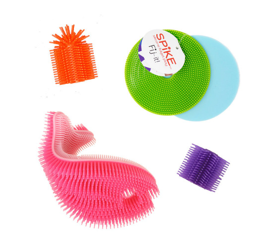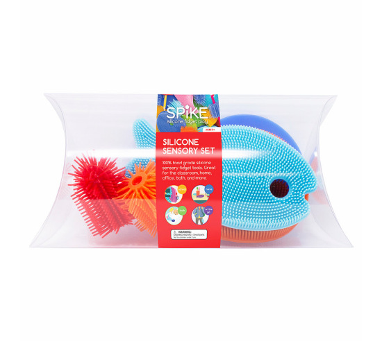 Spike silicone sensory set. Includes a silicone fish, two sicilone fij-it discs, a gripper, and a topper for the ultimate sensory experience. Colors may vary.