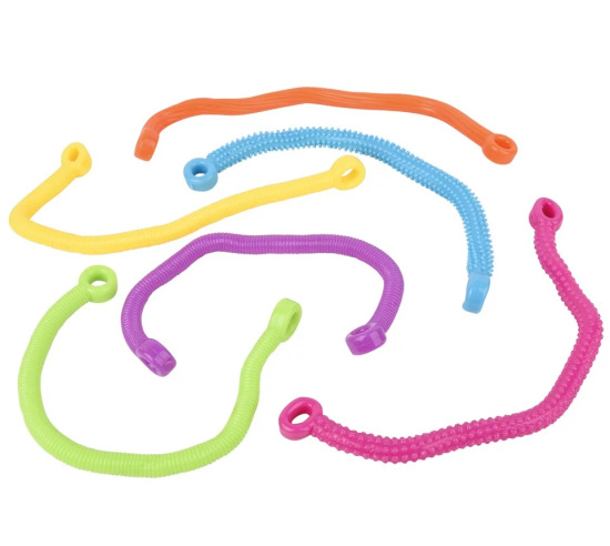 Stretch, flip, and twirl these super fun spiky strings! Perfect for fidgeting on the go. Available in rainbow colors. Approximately 12.5" long.