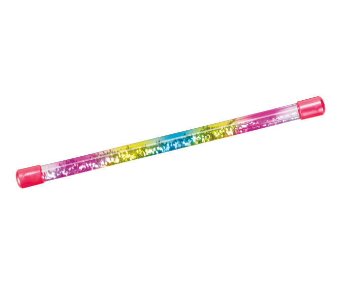Filled with water and colorful glitter, this whimsical toy comes in an assortment of colors with a unique rainbow gradient style and is a great sensory stimulator for kids. 12" long.