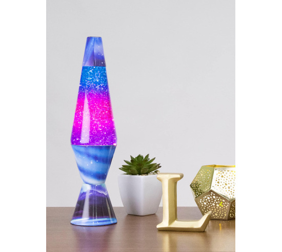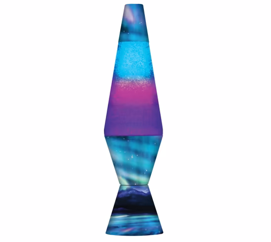 14.5" tall lamp. The Northern Lights LAVA® lamp allows you to enjoy one of the Seven Wonders of the World right at home! Colormax™ technology makes the glitter appear to change color as it flows up and down the hand-painted, tri-colored glass globe. The beautiful decal of a northern lights scene on the hand-spun base and cap of this lamp will create a relaxing environment.