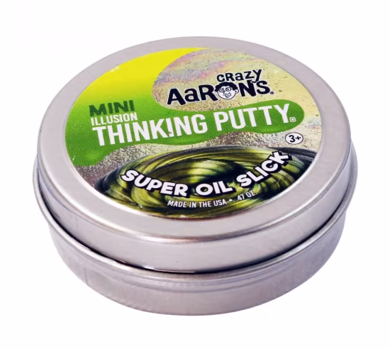 Oilslick Putty features an undulating refractive index of shifting colors that move and change with light. The Thinking Putty color that is downright mesmerizing. Tiny tin includes 0.47 oz of putty.