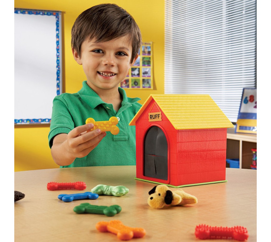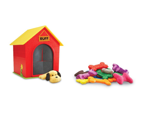 Which bone is Ruff's favorite? Cute tactile set includes bumpy, fluffy, silky, smooth and many more bones. Twenty 2" bones, plastic house, and soft dog are included. A useful toy for sensory integration and tactile teaching.