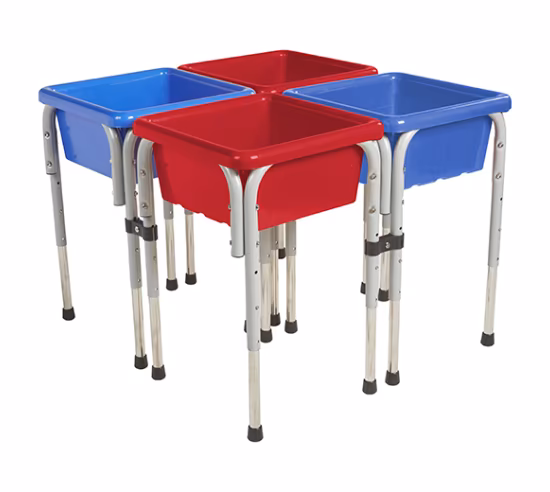 This four square sand and water table will encourage cooperative play, sensory exploration, and social interaction. Steel legs with plastic blue and red basins. Adult assembly required. These can be connected in a variety of configurations to meet your needs. 30" wide, 30" depth, and adjustable heights of 20", 22.5" and 26".