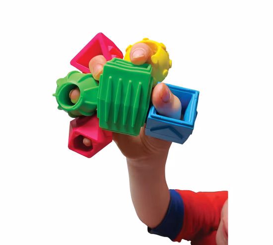 The brightly colored material is soft and flexible, yet durable enough for lots of touching and squeezing. Each shape has a recognizable geometric form: triangle, circle, oval, rectangle, square, hexagon. The surfaces have raised bumps, ridges and grooves that reflect the overall shape and stimulate the sense of touch.
