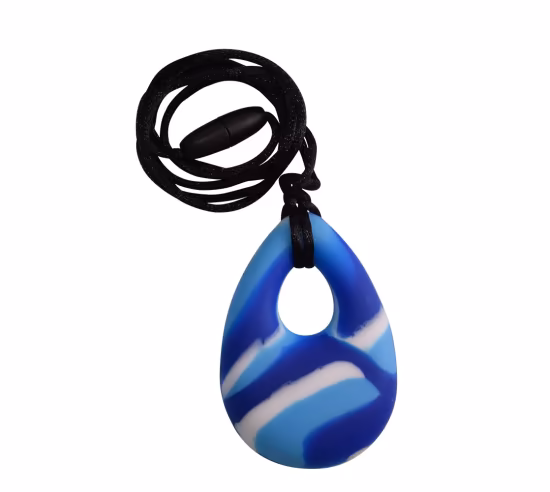Designed for light chewers, this stylish blue swirl pendant features a breakaway clasp. The pendant is approximately 2 3/4" tall x 1 7/8" wide. non-toxic, lead-free, phthalates-free, and BPA-free material