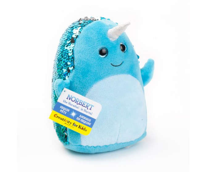 Norbert the Narwhal is lightly weighted for calming and anxiety relief but also small enough for travel. Super cute whale is relaxing and fun. With his flip sequin back, kids of all ages will like playing with Norbert. Measures 6" tall and 4" wide. Weighs 0.93 lbs.