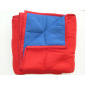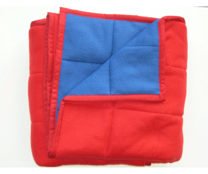 A double insulated blanket with blue on one side and red on the reverse. The red and blue combination is calming or offers visual stimulation on the opposite side. Blanket is washable, weights 8 lbs and measures 45"x60".