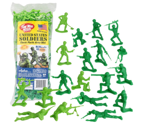 The classic, now in varying green shades! Includes 48 dark green and 48 light green troops for maximum play value. Poses include minesweeper, bazookaman, radio operator, mortar, light machine gunner, kneeling rifleman, flame thrower, crawling rifleman, prone rifleman, bayonet fighter, and officer with binoculars and handgun.
