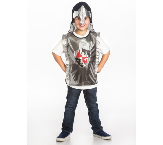 This two piece set will turn any child into a brave knight. We love costumes of bravery and the soft helmet makes it less bulky for storage, perfect for a smaller sized playroom. Washable knit fabric with silver accents. Fits an average sized 3-8 year old.