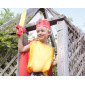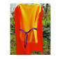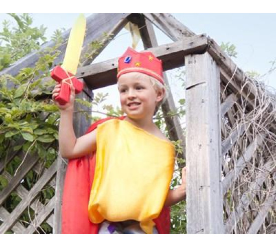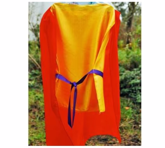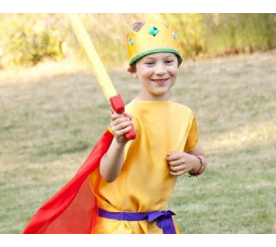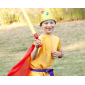 A slip on gold silk tunic with attached cape and belt for fantasy play. Children can pretend to a be a knight, super hero, prince or princess. Hand wash, hang dry. Fits most children.
