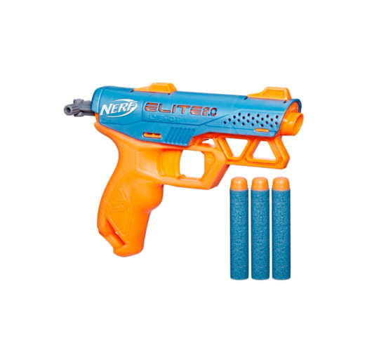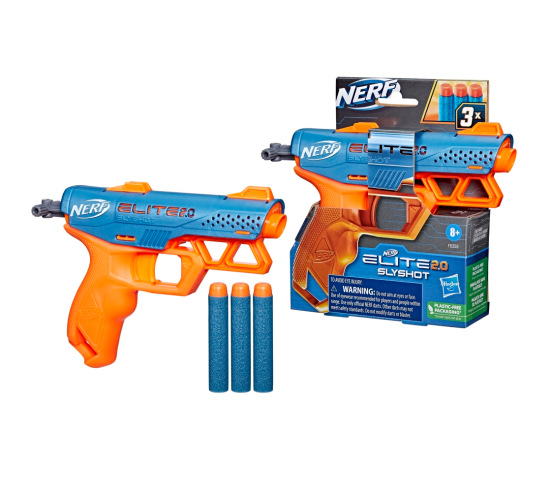 Compact Nerf Elite Slyshot is an inexpensive dart gun that features Nerf action and onboard storage to keep 2 darts onhand. Includes 3 Nerf darts.