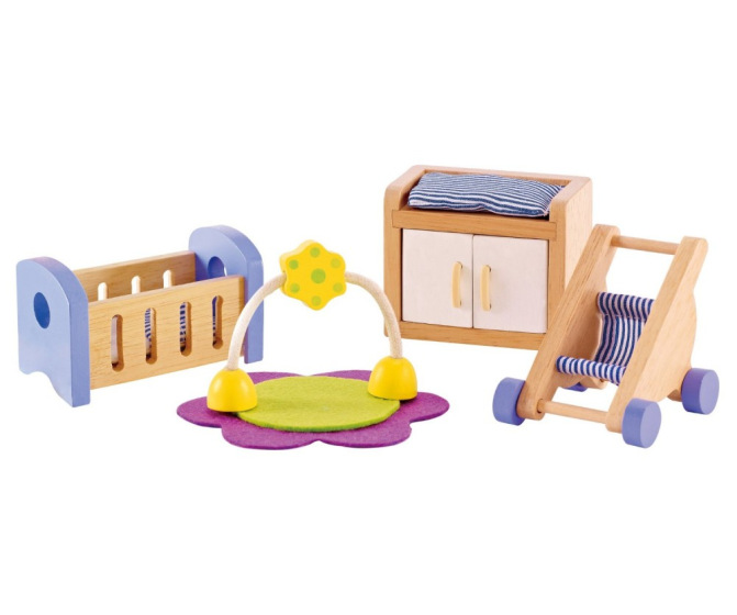 Every piece of furniture a baby needs to play, sleep, and get changed. Set includes baby crib with cloth mattress, changing table with opening cabinet and changing pad, activity mat with gym and a stroller with working wheels. Durable set fits any 1" scale dollhouse or can be used in the sand tray. Recommended age 3+