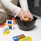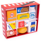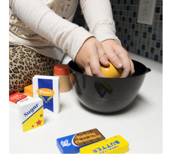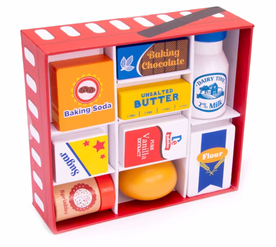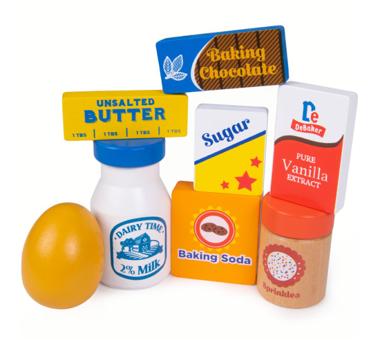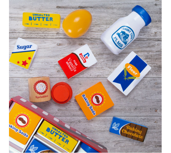 Toy ingredient set includes: baking soda, sugar, sprinkles, baking chocolate, unsalted butter, pure vanilla extract, a brown egg, milk, and flour. Everything you need to bake a cake! Made with cuts of natural wood and finished with water-based, safe paints. Promotes imaginative play.
