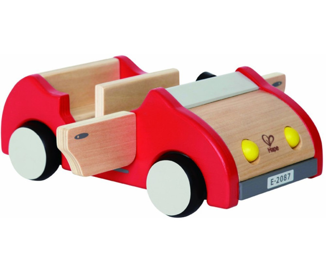A wood car with hinged doors and rotating tires will fit most dollhouse people. Nice quality, sturdy car is made of solid wood. Recommended age 3+