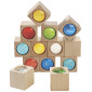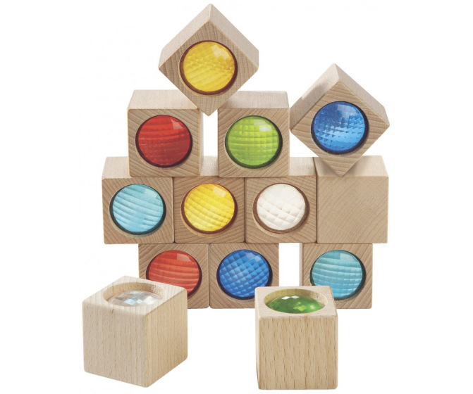 Set of 13 colorful prism blocks are made of solid beech wood and sturdy plastic. Mix and match with other blocks for general block play or for use with a sensory table or light table. Provides visual stimulation for sensory seekers. Made in Germany. Each block measures 1.5" x 1.5".