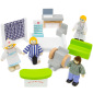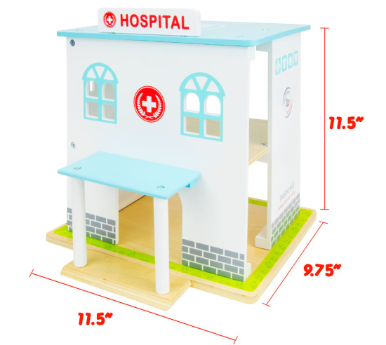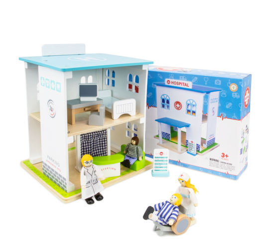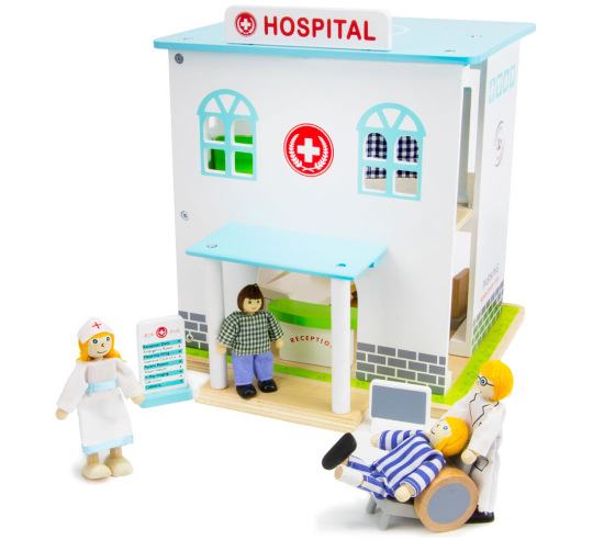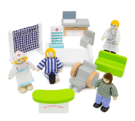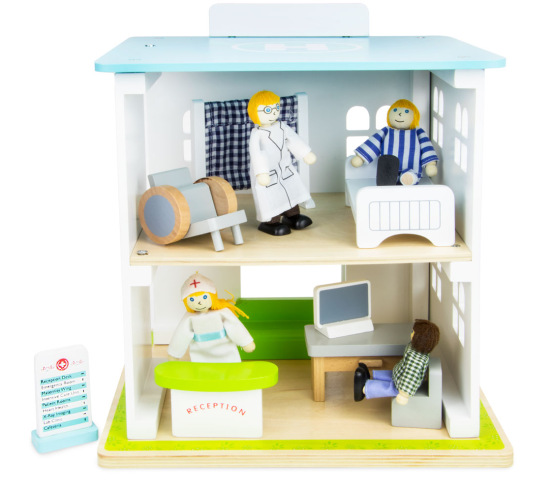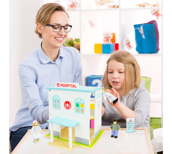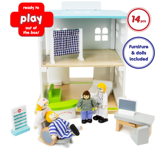 This hospital play set will be used daily for play therapy. Set includes a portable wood hospital, dolls, and hospital furniture. Even a wooden wheelchair is included. Mix and match with dollhouse dolls. Set includes doctor, nurse, two patients, hospital bed, reception desk, and more.