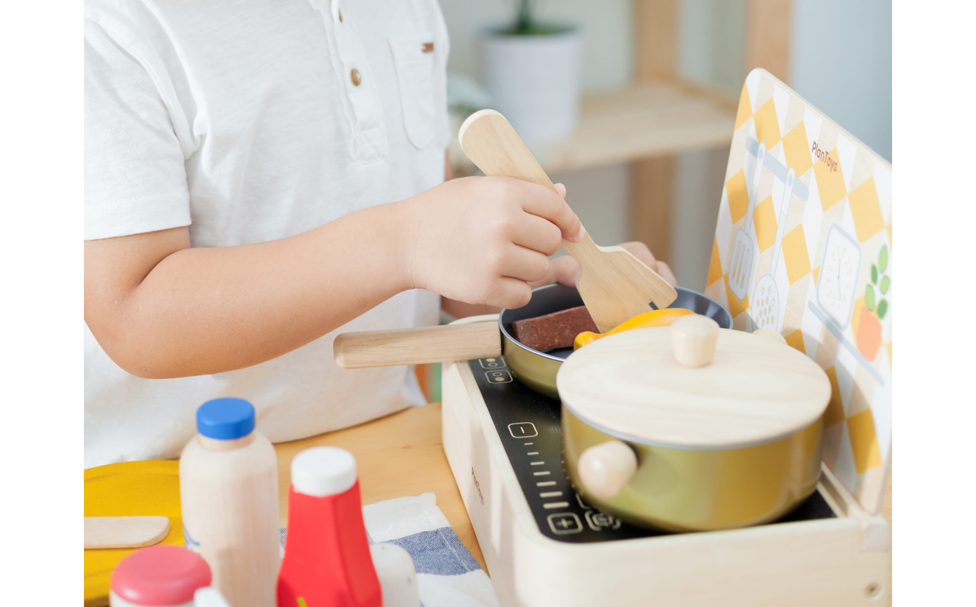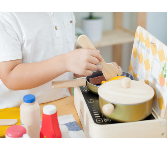 This wooden cooking set encourages creativity, role-playing, and social skills as children pretend to cook meals and share stories. It is perfect for family playtime or early childhood education settings.