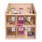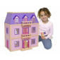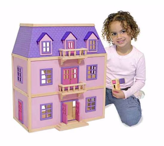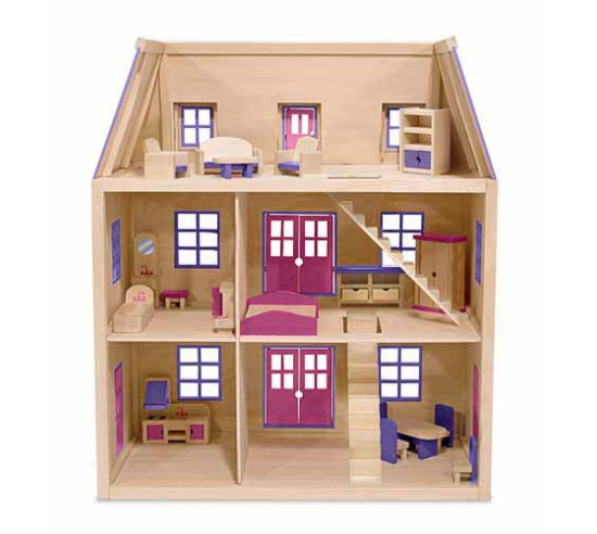 This large three-level wooden house is easy to assemble and in move-in condition. Five spacious rooms feature two movable staircases and five working exterior doors. Nineteen pieces of hand-painted furniture with working doors and drawers provide the finishing touch.