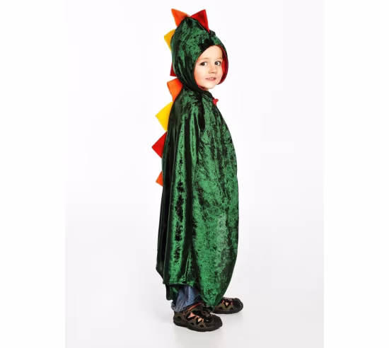 A green velvet cape with soft scales and elastic loops for thumbs create wings. One size fits average sized 3-8 year olds.