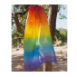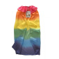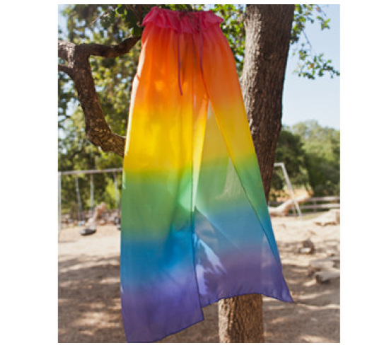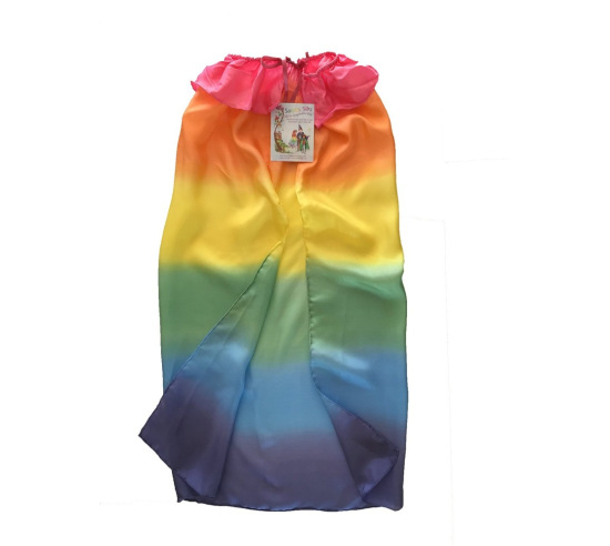A soft, rainbow colored silk cape for dress up and role play. Cape is made of silk and hand dyed. Elastic neck band and satin ties ensure easy on, easy off. Cape is 32" in length. Fits most 3-8 year olds.