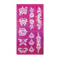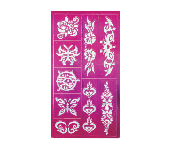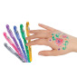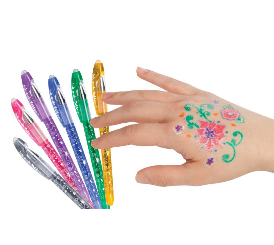 A super-fun, popular temporary body art gel pen set. Includes 6 vibrantly colored gel ink tattoo pens and 3 stencils. Each pack comes with 6 individual bright shimmering-colored pens including pink, yellow, green, blue, purple, and silver. Stencils include a variety of shapes and designs, including flowers, butterflies, and hearts. Gel pen ink is nontoxic and completely washable, so tattoos are easy to put on and take off.