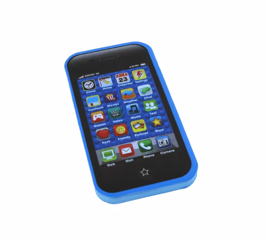 An inexpensive toy rubber cell phone for playing and role play. Slightly smaller than a real phone, perfect for small hands. Rubber with sticker face. 4.5" x 2.25".