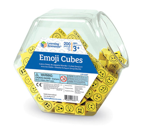 Set of 200 soft emoji dice in a storage container. These dice will be enjoyed by elementary aged children in unlimited ways! Ideas for getting started