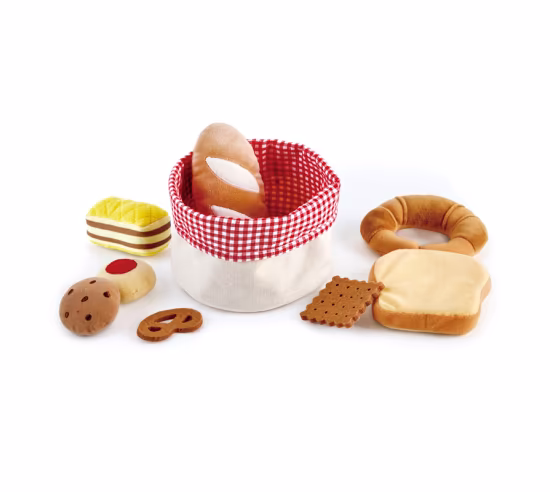 Fill your basket with a whole bakery of bread for you and your friends! Includes one piece of toast, one baguette, one croissant, one choc chip cookie, one soda biscuit, one jam cookie, one heart-shaped butter cookie and one piece of layer cake! Made from felt and fabrics which have a soft, realistic texture.