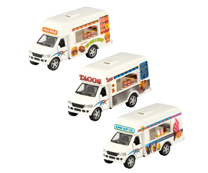 Food truck's here! Included is one randomly assorted food truck: you get either the Fast Food truck, the Ice Cream truck, or the Taco truck. Order more than one for variety. Features opening doors and die cast construction. 5" long.