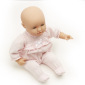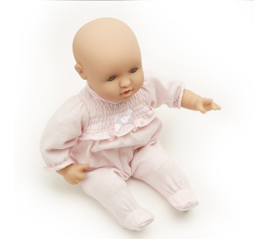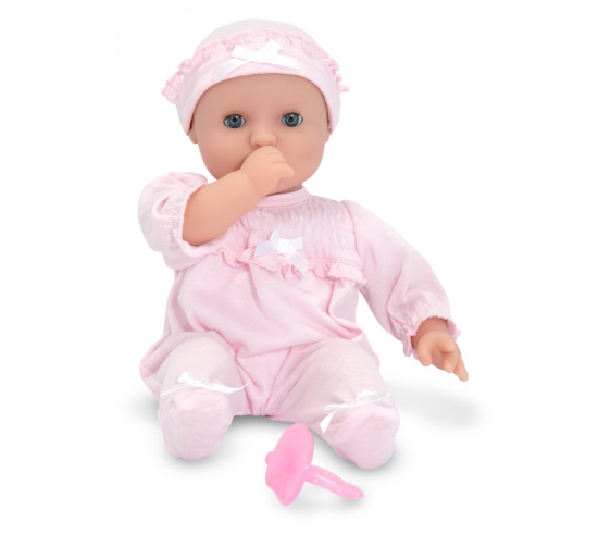 A twelve inch soft bodied baby doll dressed in a pink outfit and cap. Baby can suck thumb or included pacifier and eyes open and close. A lightweight, highly rated baby doll with a light skin tone.