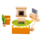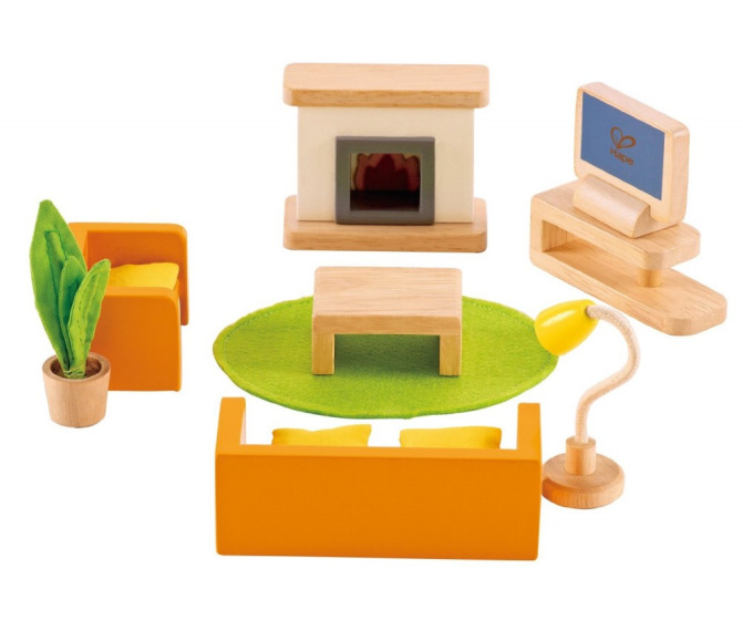 Foster imaginative play or use these nine pieces for sand tray. From Hape, set includes coffee table, easy chair, fireplace, sofa, media stand, big screen TV, rug, plant, and reading lamp. The chair and sofa have cloth cushions; the bendable plant and gooseneck lamp are posable. Made from Baltic Birch, Rubberwood, and Maple, this media room will last for years.